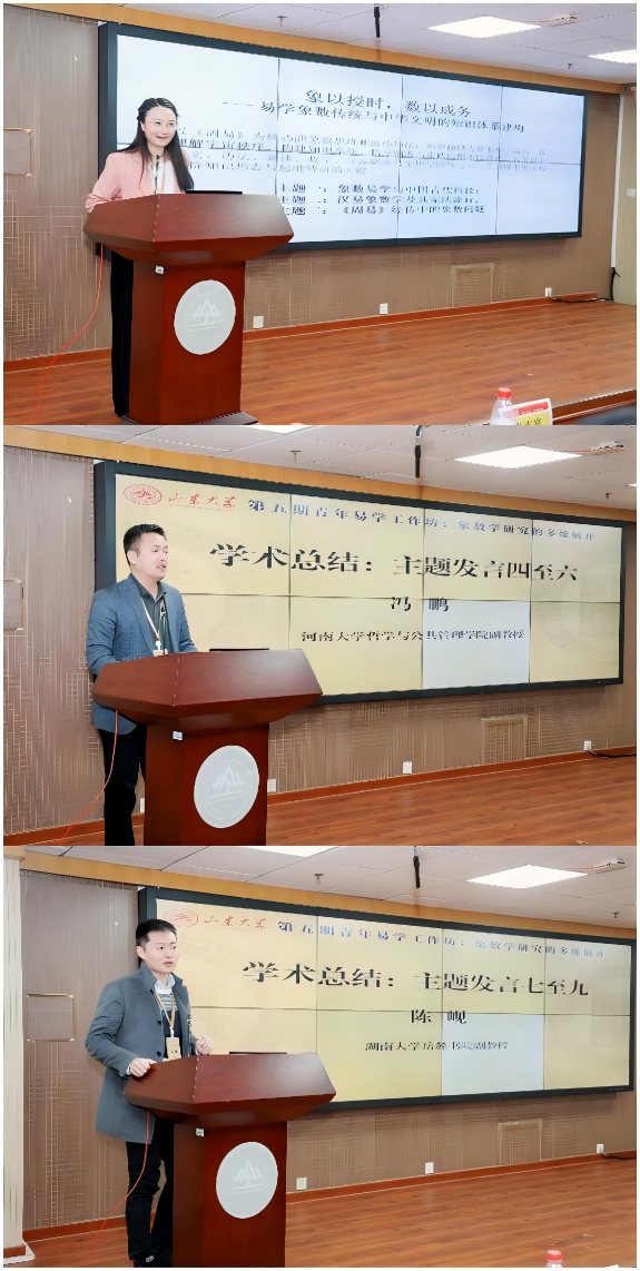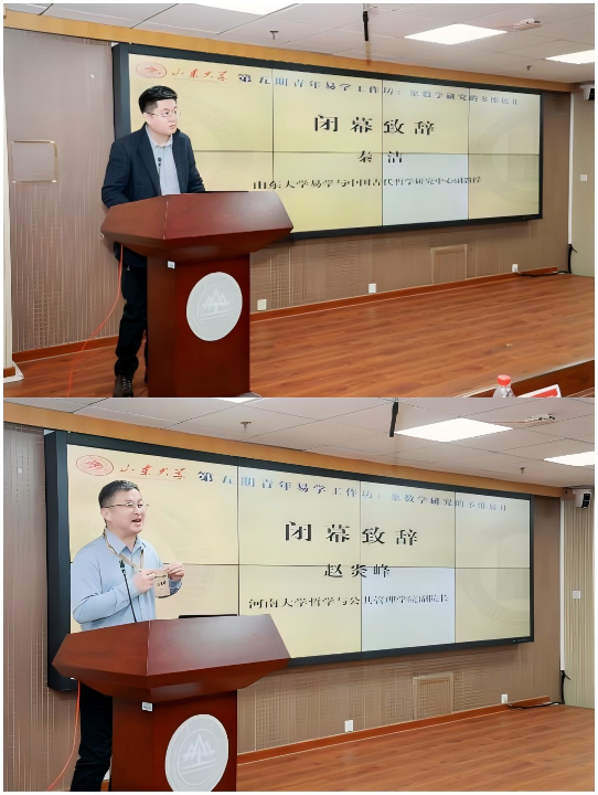 闭幕式中,山东大学易学与中国古代哲学研究中心副教授秦洁和河南大学哲学与公共管理学院副院长赵炎峰分别代表会议主办方和下期主办方致辞。秦洁在致辞中向支持本次工作坊的各位学者致以诚挚谢意,并介绍了工作坊举办的初衷和本期主题设置的意义。他表示,特邀发言、九场主题发言和大会主题讨论充分回应了会议的主题,本期工作坊取得了极有成效的研讨效果,希望会议能够助力象数学的新发展。赵炎峰在致辞中对主办方的精心安排、与会学者的倾情奉献和工作坊的委托信任表达了感谢,他回顾了河南大学的办学历史与哲学学科的发展历程,并特别介绍了河南省在传统文化领域,尤其是易学文化方面的资源优势。他向与会学者发出诚挚邀约,期待大家齐聚河南,共赴下一期工作坊的学术之约。