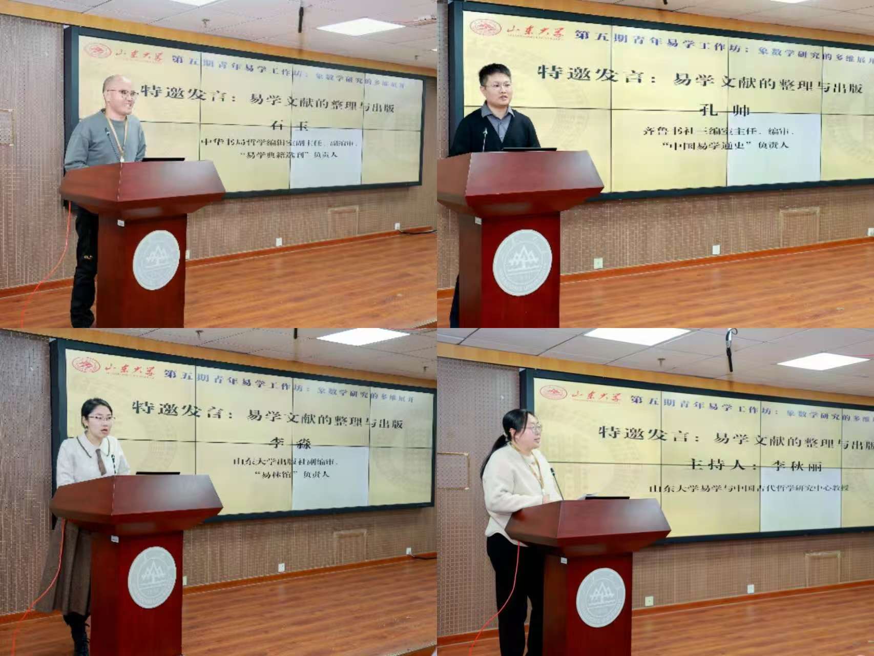主题讨论环节后,大会进行了题为“易学文献的整理与出版”的第二场特邀发言。中华书局哲学编辑室副主任、副编审、“易学典籍选刊”负责人石玉,齐鲁书社三编室主任、编审、“中国易学通史”负责人孔帅,山东大学出版社副编审、“易林馆”负责人李淼分别介绍了所在出版单位于易学文献出版方面的成果以及未来的工作计划。本场特邀发言由山东大学易学与中国古代哲学研究中心教授李秋丽主持。