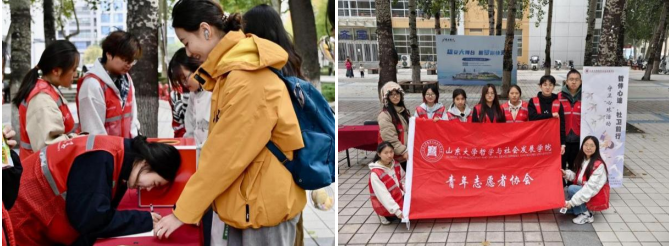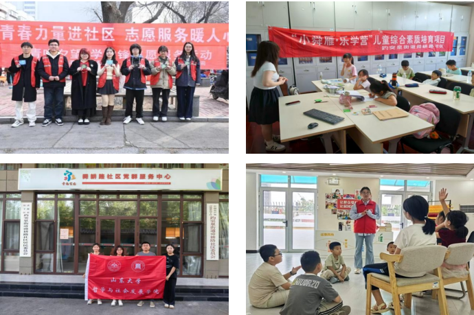 学院志愿服务工作完善有序,志愿技能培训科学全面,拓展领域立体多元,服务成果遍地开花。学院青年志愿者协会获评“山东大学十佳志愿服务组织”称号,蝉联山东大学青年志愿者联合会常任理事单位。选派多批志愿者赴济南及周边县市社区开展服务,累计向历下区未成年人保护中心、智远街道、瓷爱空间等志愿基地派出志愿者1300余人次,服务时长近万小时,志愿者与服务对象心手相牵,传递着专业力量和爱的希望。