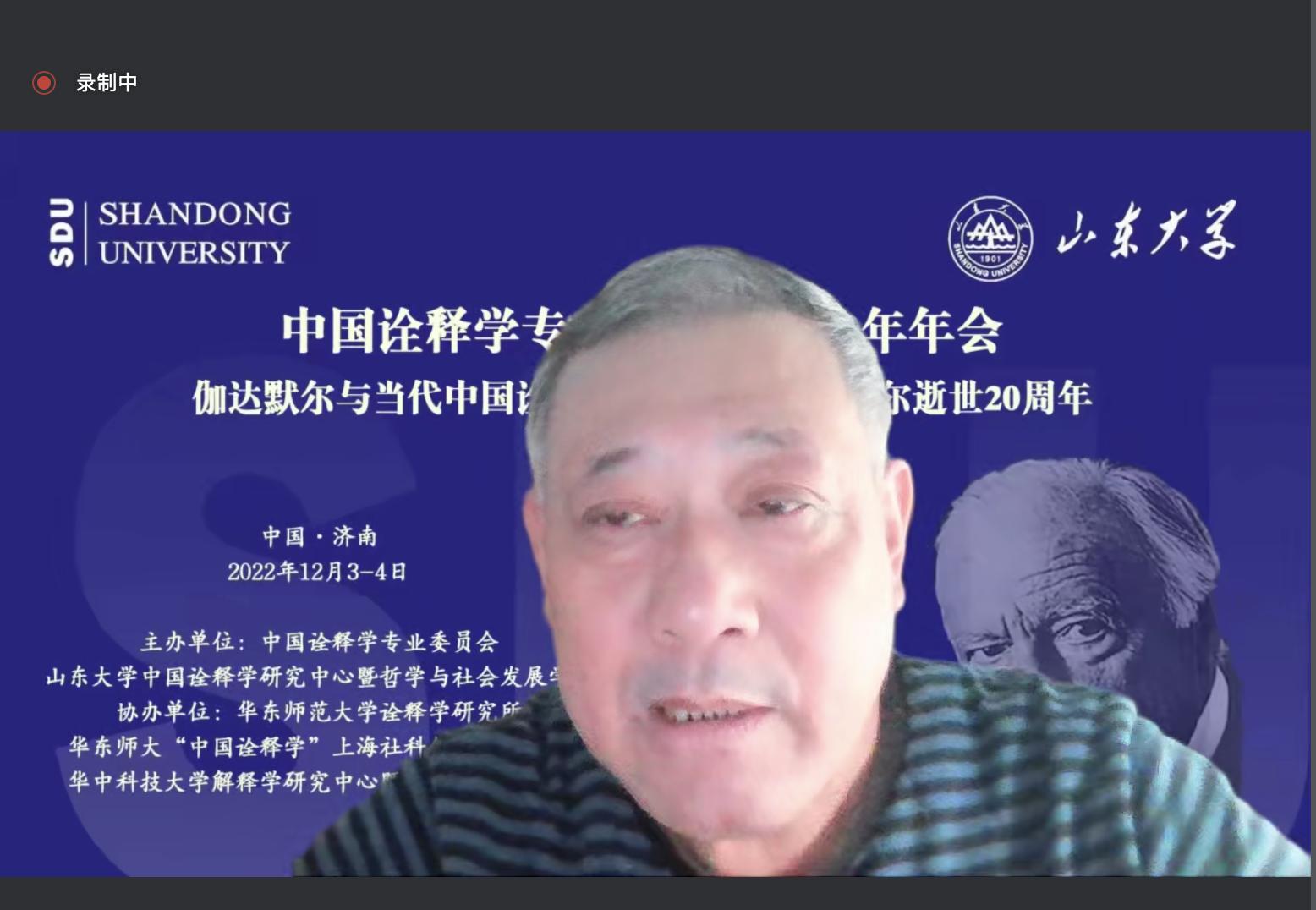 2022年12月3日至4日,由中国诠释学专业委员会、山东大学中国诠释学研究中心、山东大学哲学与社会发展学院主办,华东师范大学诠释学研究所、华东师大“中国诠释学”上海社科创新研究基地、华中科技大学解释学研究中心暨伽达默尔文献馆协办的“中国诠释学专业委员会2022学术年会在线上成功举行。今年是著名哲学家伽达默尔逝世20周年,中国诠释学专业委员会以“伽达默尔与当代中国诠释学”会议主题,纪念这位享誉世界的诠释学大师,同时讨论诠释学中国话语体系的创造性建构取得的成果。来自北京大学、清华大学、山东大学、复旦大学、华中科技大学、中山大学、华东师范大学、中国社科院大学、大连理工大学、湖南大学、安徽大学、黑龙江大学、南京师范大学、深圳大学、山东师范大学、广西大学、曲阜师范大学、安徽师范大学、山东财经大学、南方医科大学、华东理工大学、山东省委党校、台州学院、韶关学院等近30多所高校及科研机构的学者出席了会议,就伽达默尔与诠释学的未来、中国诠释学的创造性构建、中国诠释学的多元探索、西方诠释学的多维发展、艺术的诠释学向度与现代性、诠释学与实践智慧、中国经典诠释之审思、诠释学的新视域等话题展开了为期两天的热烈而深入的讨论,全景式展现了中国学术界诠释学研究、特别是诠释学中国化所取得的最新成果。