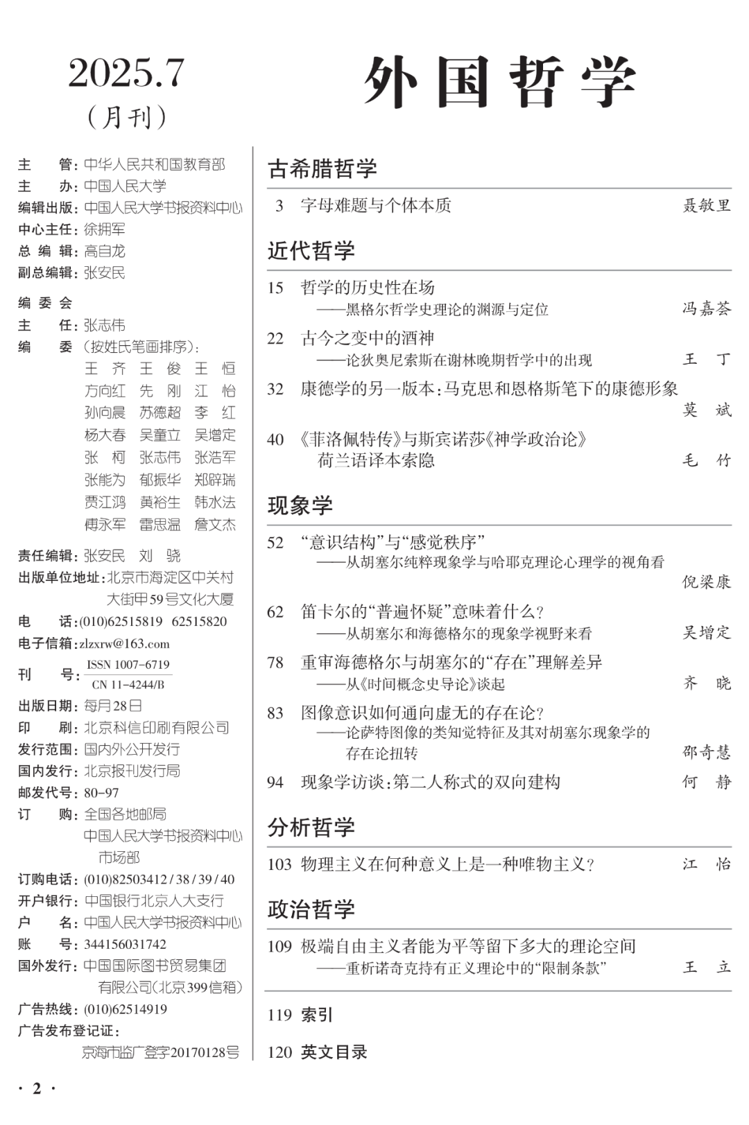《外国哲学》精选西方哲学史论、著名哲学家思想、现代西方各哲学流派、东方哲学、比较哲学、哲学方法论等方面的优秀研究成果;关注热点,紧跟前沿,突出主流,集中反映外国哲学的研究动态与总体流向;深度诠释,致力构建外国哲学研究前瞻性学术窗口。设有西方哲学综论、理解与翻译、古希腊哲学、德国古典哲学、现象学、分析哲学、政治哲学、后现代哲学、学术争鸣、学术动态等亮点栏目。