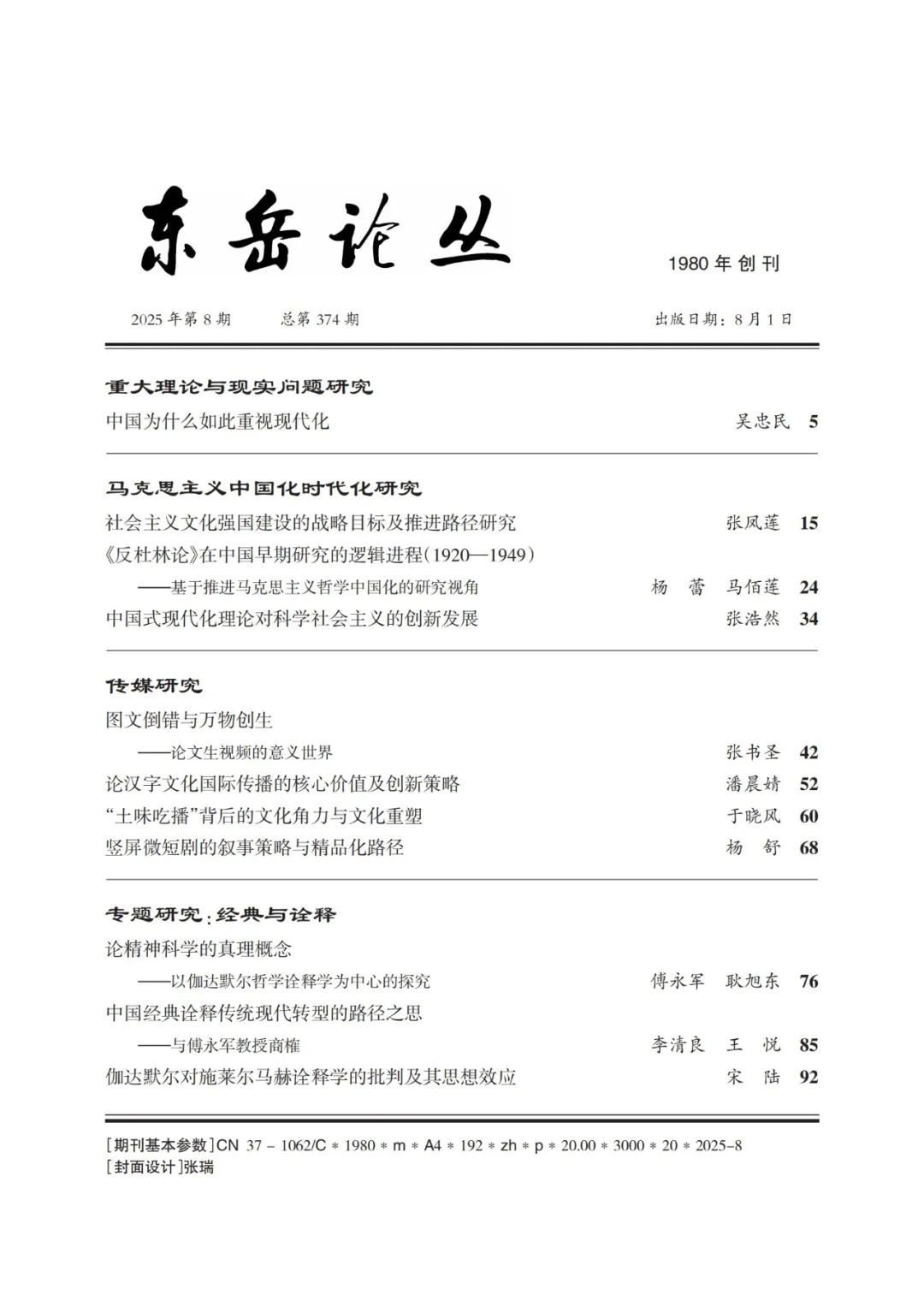 近日,哲学与哲学与社会发展学院傅永军教授与硕士研究生耿旭东共同在《东岳论丛》2025年第8期发表了题为《论精神科学的真理概念——以伽达默尔哲学诠释学为中心的探究》的高质量论文。