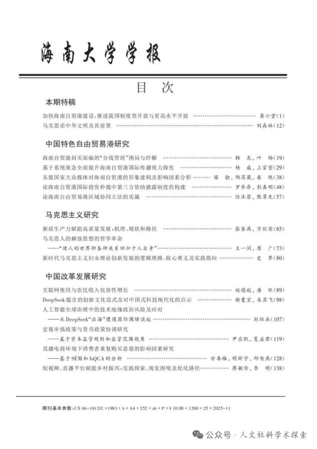 近日,山东大学哲学与社会发展学院刘森林教授在《海南大学学报(社会科学版)》2025年第6期上发表了题为《马克思论中华文明及其前景》的高质量论文,系该期特稿之一。