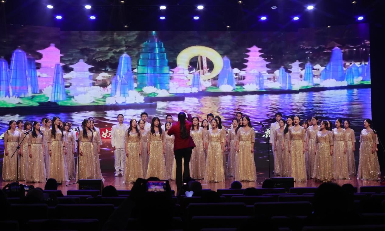 接着,哲社学院研究生会合唱团在学院副书记杨晓玲、辅导员吕汶鑫的带领下演唱《看山看水看中国》,将家国情怀与青春朝气融为一体。