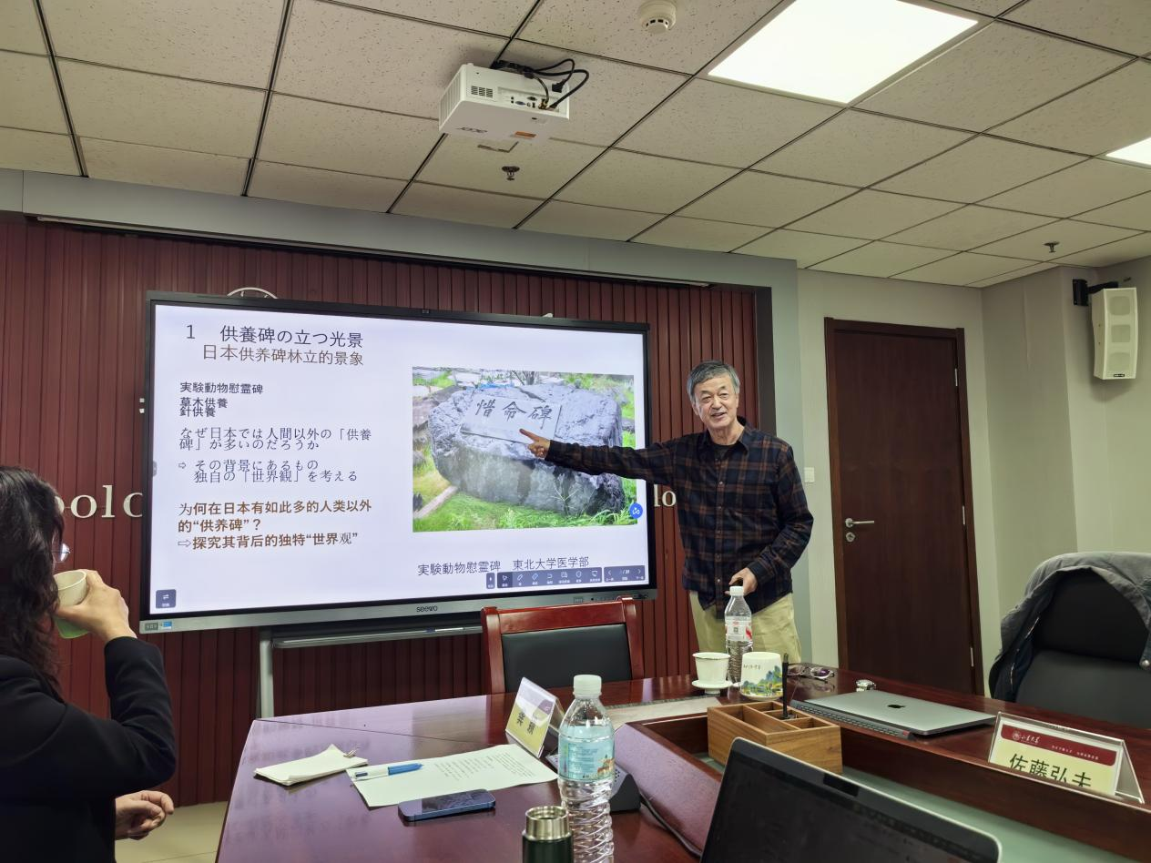 在提问互动环节,佐藤教授就东亚思想如何克服人类中心主义等问题与在场师生进行了深入交流。佐藤弘夫教授的讲座以其独特的视角和深厚的人文关怀,不仅系统梳理了东亚哲学中超越人类中心主义的宝贵思想资源,更将古典智慧与后疫情时代的全球性挑战紧密结合。此次讲座极大拓宽了我院师生的学术视野,启发了大家从关系性的东方哲学的角度,重新反思人与自然、人与万物的根本联系,为学院的学术研究注入了新的活力与深刻启示。
