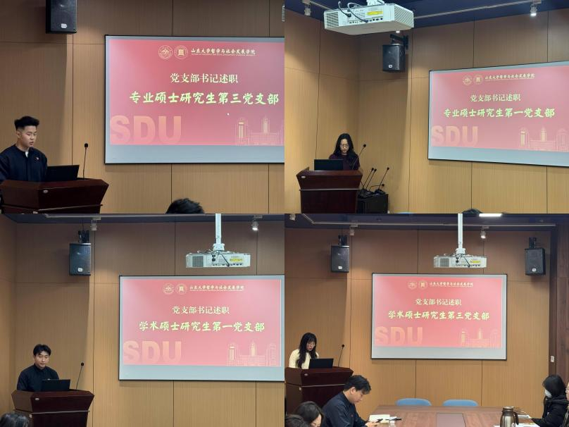 会上,专业硕士第三党支部、第一党支部书记,学术硕士第三党支部、第一党支部书记依次作述职报告,其余各支部书记提交书面述职材料,与会人员结合述职报告及日常工作表现进行民主评议打分。各支部书记紧紧围绕理论武装强化、组织基础夯实、主题党日开展、党员教育管理等核心工作,系统汇报了2025年度支部工作成效与特色亮点,详细介绍了跨学院联学共建、红色研学实践、党建与学术深度融合等创新举措的开展情况。同时,各支部书记坚持问题导向,客观剖析了当前支部工作中存在的党建品牌辨识度不足、与党员联系服务不够紧密等突出问题,并结合支部实际明确了具体整改措施与下一步工作思路。