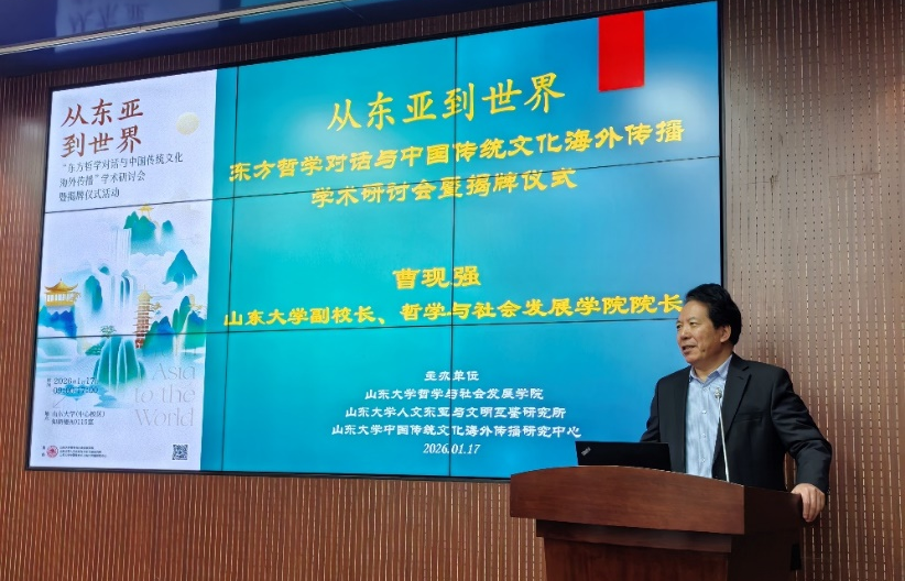 2026年1月17日,“从东亚到世界:东方哲学对话与中国传统文化海外传播”学术研讨会暨揭牌仪式在山东大学中心校区举办。山东大学党委常委、副校长曹现强出席会议并致辞。
