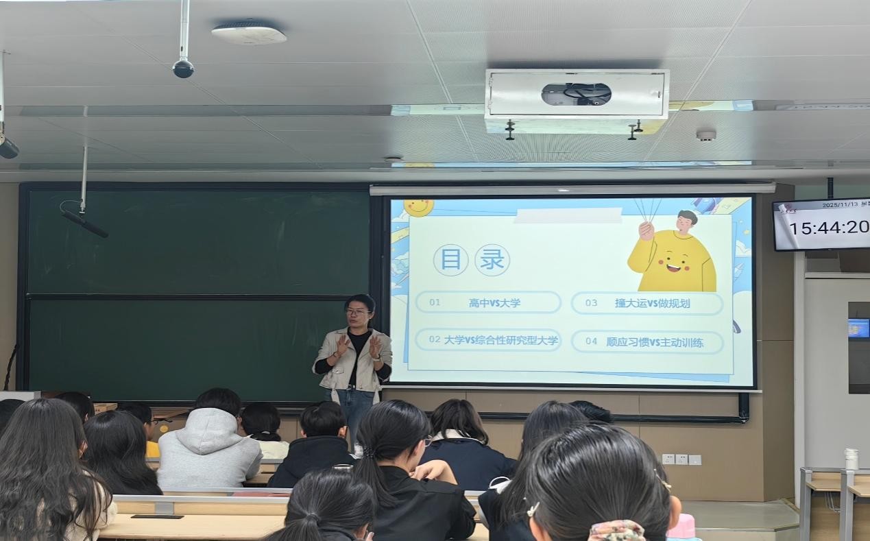 讲座伊始,翁祥栋以“高中VS大学”“撞大运VS做规划”等四组鲜明对比切入,结合大学生常见的心理适应困境,深入剖析环境转换与角色蜕变带来的双重挑战。她指出,高中阶段的“被安排式节奏”到大学“自主选择式旷野”的转变,不仅是学习模式的更迭,更易引发迷茫、焦虑等心理波动,而科学的生涯规划正是破解此类心理困境的关键抓手,“规划不是束缚,而是帮你在‘旷野’中锚定坐标,让成长有方向、心理有依托”。