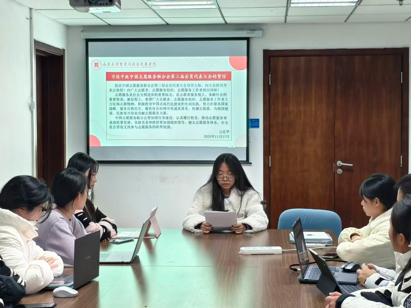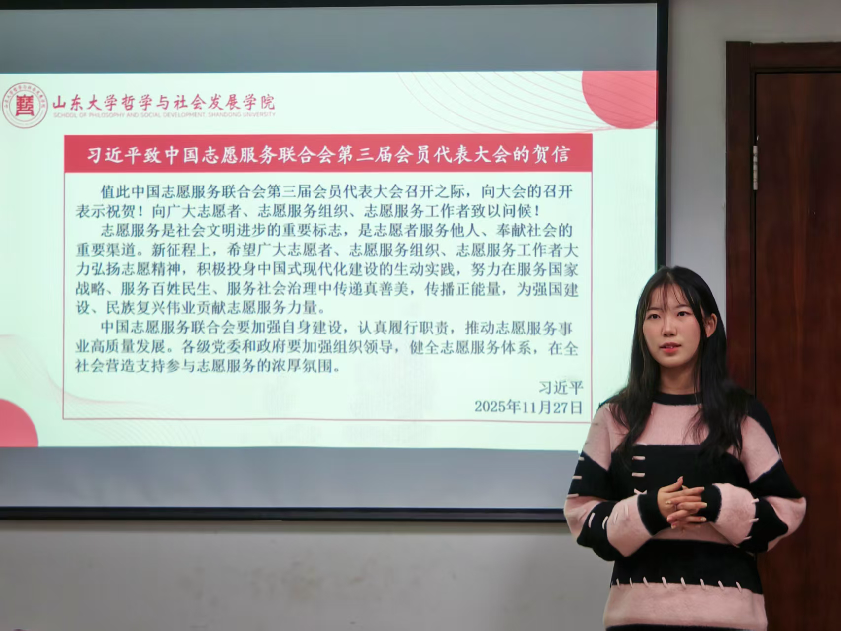 为深入学习习近平总书记致中国志愿服务联合会第三届会员代表大会的贺信精神,推动志愿服务与国家战略深度融合,12月5日,在共青团山东大学哲学与社会发展学院委员会指导下,哲学与社会发展学院青年志愿者协会于知新楼A1606开展“学习贺信精神,践行志愿担当”中国志愿服务联合会第三届全会员代表大会精神学习主题团课,引导青年学子以志愿行动诠释担当。