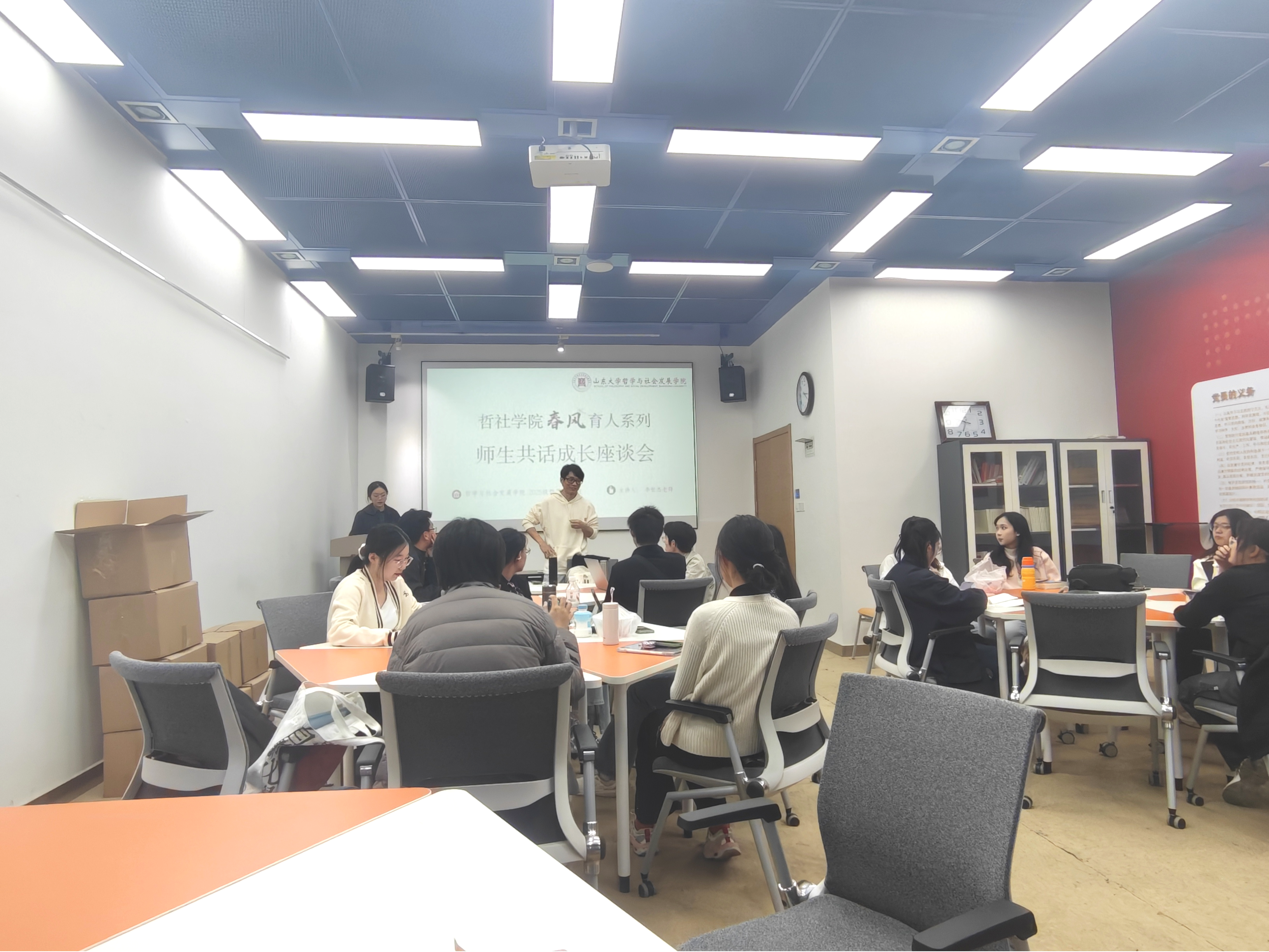 为帮助新生更好适应大学学习生活、夯实专业基础、明确发展方向,2025年11月14日下午,山东大学哲学与社会发展学院哲学强基班在知新楼召开“春风”主题经验分享会。班主任李世杰主持会议,2025级哲学强基班全体学生参加,2023级优秀学生代表王抱朴通过线上方式作经验分享。