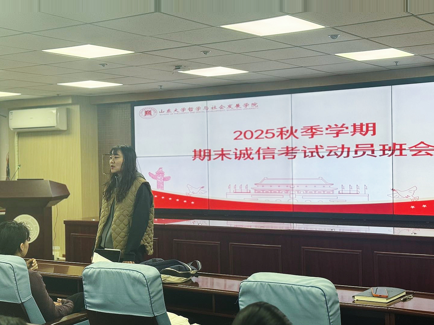 为严肃考风考纪,强化学生诚信考试意识,同时引导学生以期末为节点梳理成长路径,12月22日,山东大学哲学与社会发展学院2024级本科生考前诚信考试主题班会如期举行。班会由辅导员班梦姣老师主持并主讲,2024级全体本科生共同参与。