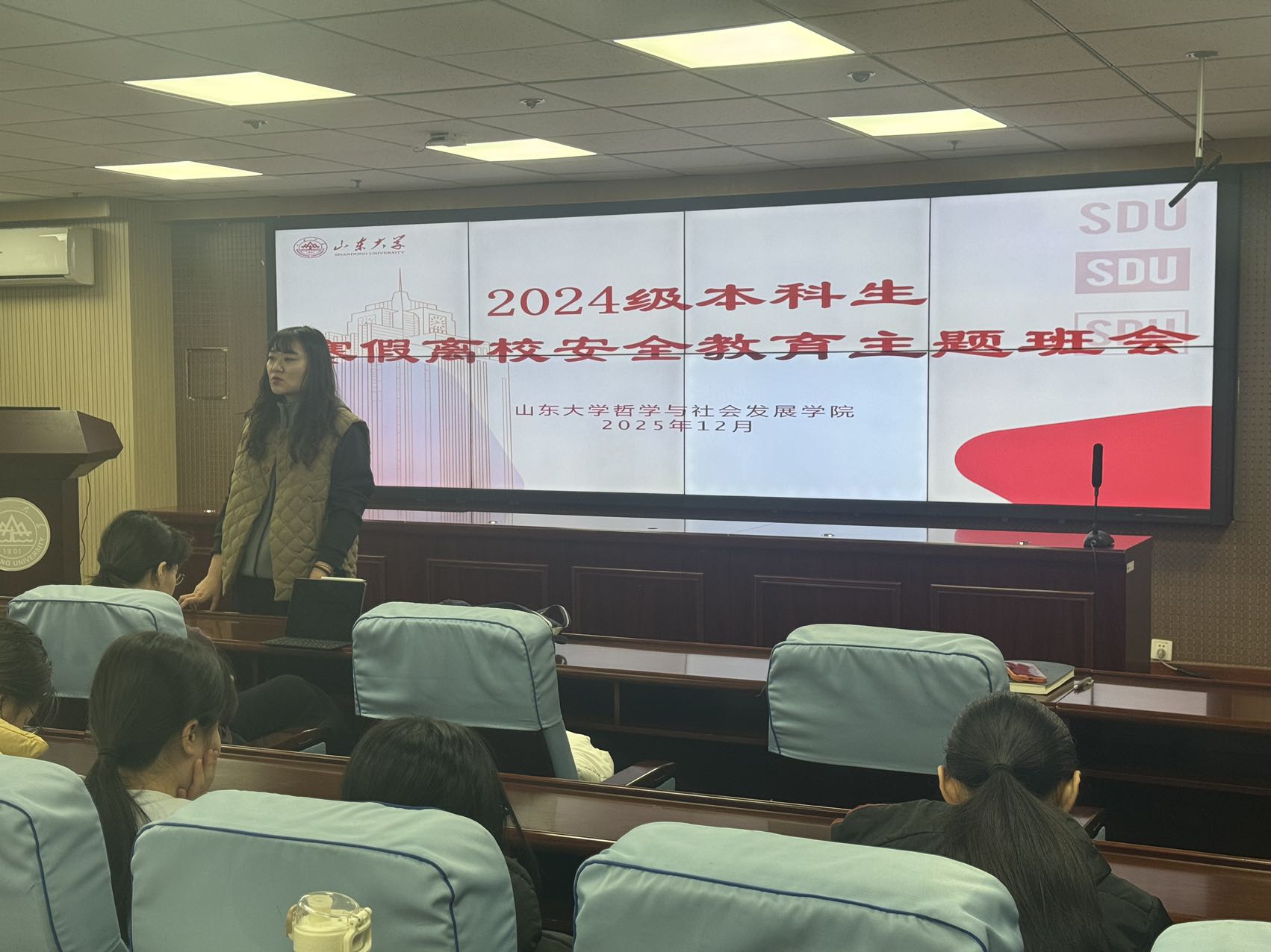 为切实做好寒假期间学生安全管理工作,引导学生充分利用寒假提升自我,1月8日,山东大学哲学与社会发展学院2024级本科生寒假离校安全与发展指导班会顺利召开。班会由辅导员班梦姣主持并,2024级全体本科生参会。