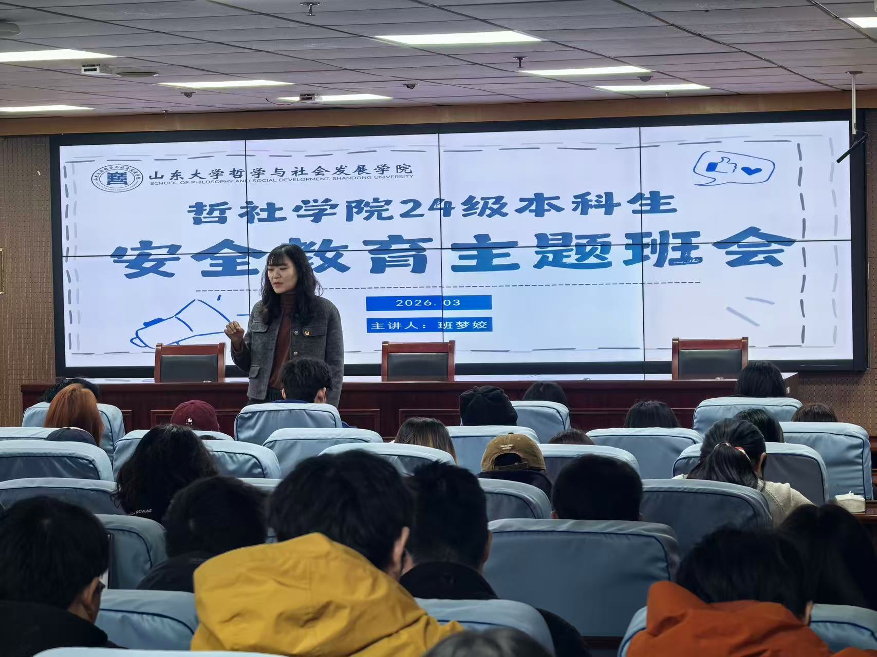 为切实调适2024级学生心理状态、强化安全防护意识,3月12日,山东大学哲学与社会发展学院2024级心理健康暨校园安全教育班会举行。2024级本科生辅导员班梦姣出席会议,重点围绕心理健康与校园安全展开细致指导。