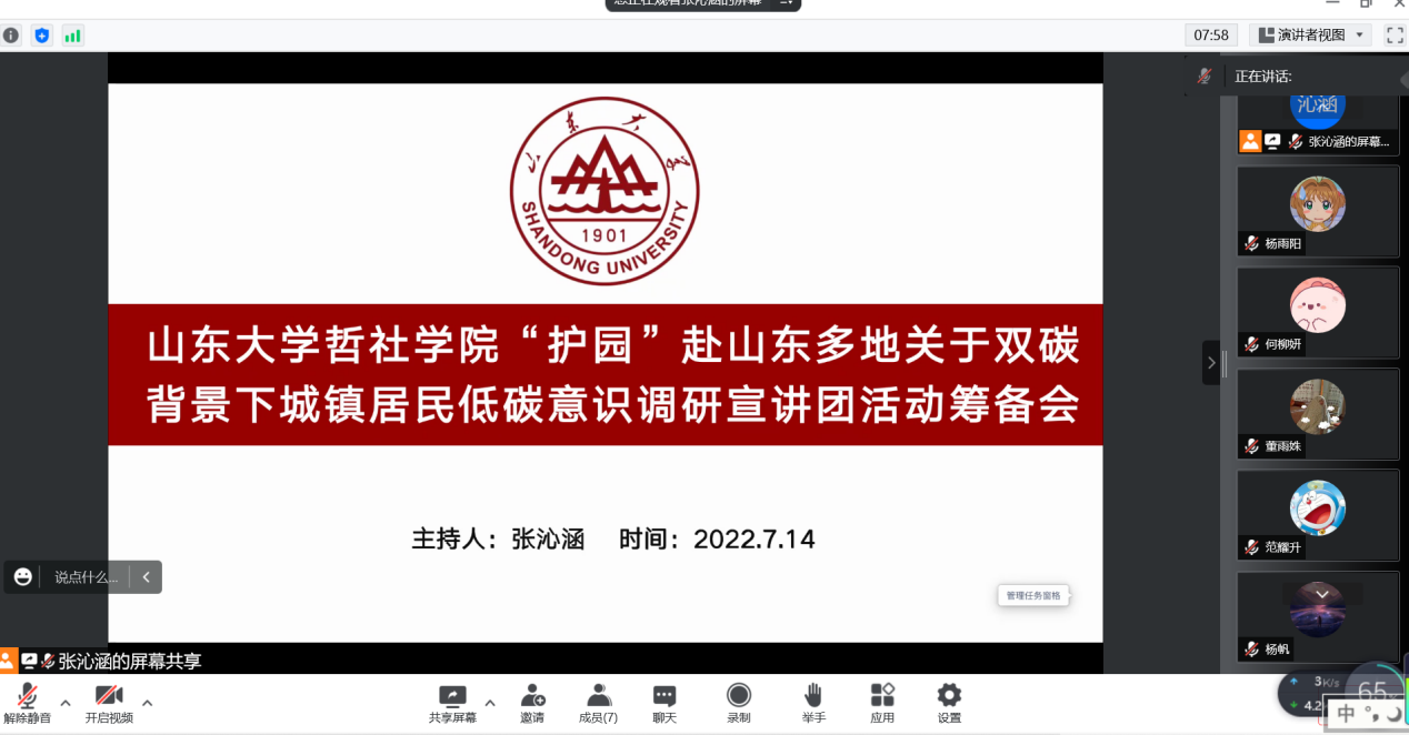 2022年7月14日晚8时,山东大学哲学与社会发展学院“护园”赴山东多地关于双碳背景下城镇居民低碳意识调研宣讲团在腾讯会议上召开暑期社会实践活动筹备会。队长张沁涵主持,来自哲学、社会学、新闻学专业的6名团队成员参与。